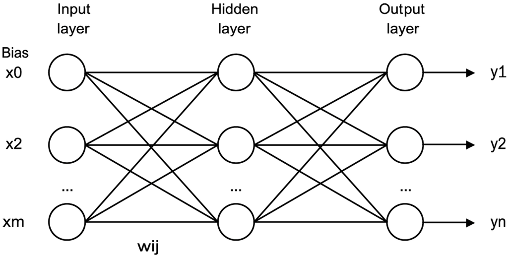 ANNs are self-adaptive methods where few priori assumptions about the models for problems are given. They imitate the activities of human brain: they learn knowledge and result in weights change. Figure 1 shows the structure of the artificial neural network, which has an input layer, a hidden layer and an output layer. The number of nodes of the input layer is m, which transfer (x1–xm) to each neuron in the hidden layer. Except for the m input values, there is another constant input x0 called “bias” with value 1.0, “bias” is connected with hidden layers too. All inputs are multiplied by a weight and summed together. Finally, an activation function is used to control the amplitude of the output.