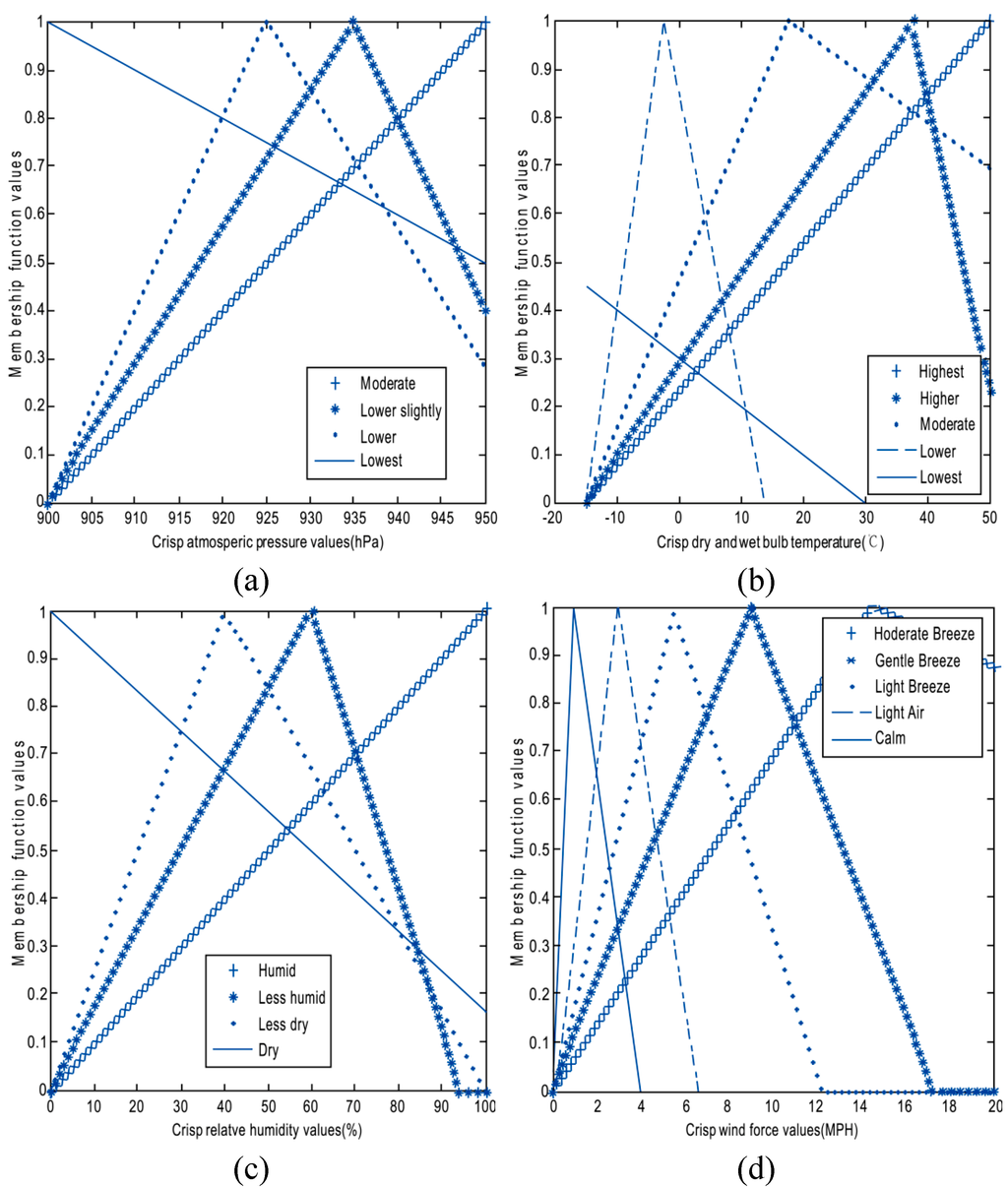 Stage 1: In this stage, crisp numbers are mapped to corresponding fuzzy sets in accordance with the membership function curves shown in Figure 3. Now we take Figure 3a as an example to describe how we use the membership function curves to determine the corresponding fuzzy set of a crisp number. There are four membership function curves shown in this panel. Each curve is used to read the membership degrees corresponding to the atmospheric pressure values for one of the different fuzzy sets named “Lowest”, “Lower”, “Lower slightly” and “Moderate”, respectively. For example, given a crisp number “910” whose membership degree is “Moderate”, we can get the maximum membership degree value of the membership function curve for “Moderate” compared with the other three in Figure 3a, and then we map the number “910” to fuzzy set “Moderate”. Similarly, the membership function curves shown in Figure 3b–d are used to map crisp dry and wet bulb temperatures, humidity values and wind force values to corresponding fuzzy sets for temperature, humidity and wind. Thus, the training samples of ANNs are transferred into a fuzzy inference system.
