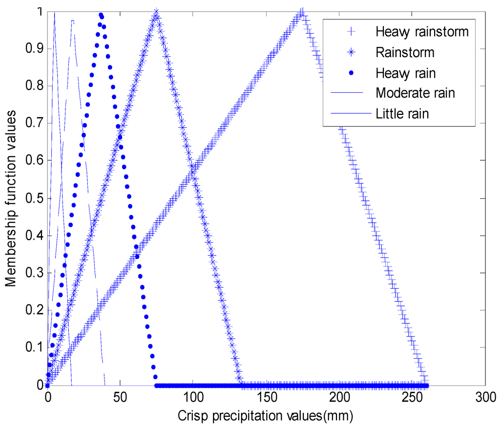 Atmospheric pressure falls into four fuzzy sets in Table 1; relative humidity falls into four fuzzy sets shown in Table 2; dry and wet bulb temperature falls into five fuzzy sets shown in Table 3; wind speed falls into five categories (fuzzy sets) shown in Table 4; precipitation falls into five fuzzy sets shown in Table 5. In order to test NFIS-WPM (Ave), numbers from 0 to 4 inclusively are given to represent No rain, Light rain, Moderate rain, Heavy rain and Rainstorm, respectively (Figure 4) [37,38,39].