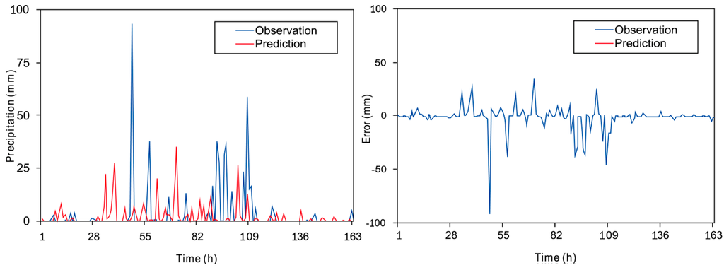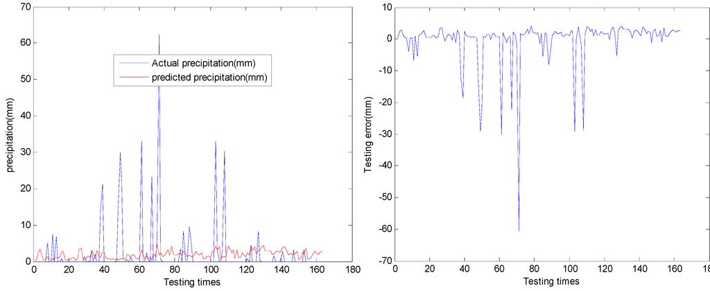 (1) ANNs are used to predict the exact precipitation for weather forecasting, but lead to the non-accuracy of the prediction outputs. Hitting rate is 0, which means that the rate of prediction accuracy is 0. Figure 5 shows that ANNs never accurately forecasted strong rainfalls whose precipitations were more than 20 mm during the experimental time period. However, it had forecasted rainfalls in the non-rainfall days during the experiment. Therefore, we believe that ANNs are almost impossible to forecast precipitation.