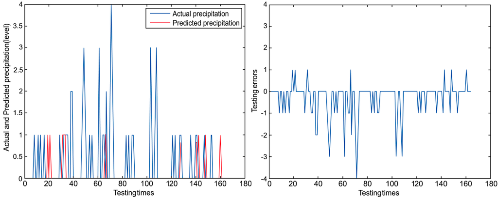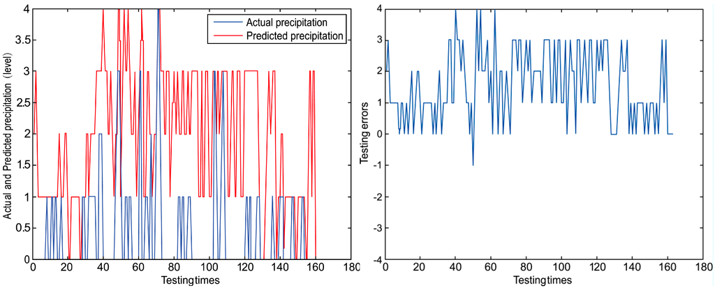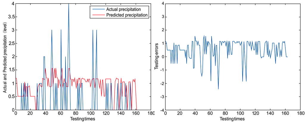 Under these circumstances, we adopt the policy of rounding up. For example, if “1” is to represent “Little rain” and “2” is to represent “Moderate rain” and there is a number “1.6”, so we give the prediction result as “Moderate rain”.