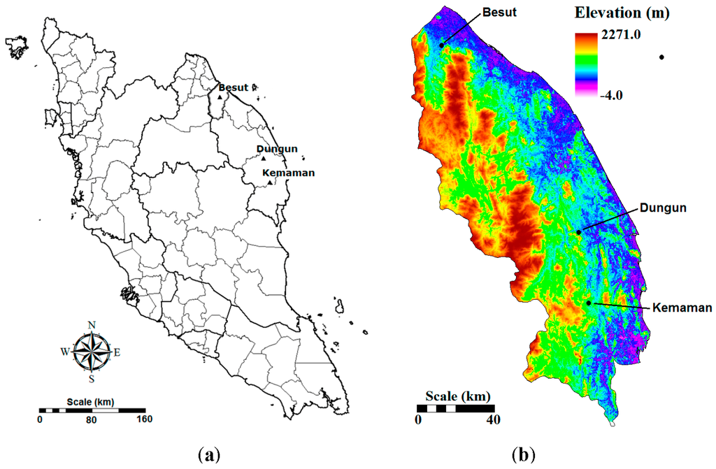 Rainfall data recorded at three stations, namely Besut, Dungun and Kemaman, on the east coast of Peninsular Malaysia were used to downscale the extreme rainfall indices using GP. The location of rainfall stations on the map of Peninsular Malaysia is shown in Figure 1a. The climate of the area can be loosely divided into four seasons: the NE monsoon from October to February; the SW monsoon from April to August; and two inter-monsoonal transitional periods in March and September. The east coast is considered as the wet belt of Peninsular Malaysia, with an annual rainfall of 2800 mm. Heavy rainfall on the east coast of Peninsular Malaysia is usually associated with the NE monsoon. Maximum precipitation usually occurs during the months of November and December. On the other hand, cloudless skies are observed during the SW monsoon. The topographic map of the study area, prepared using the Advanced Spaceborne Thermal Emission and Reflection Radiometer Global Digital Elevation Model, is shown in Figure 1b. The elevation in the area varies from −4 m on the narrow coastal plain to 2270 m in the interior mountainous region.