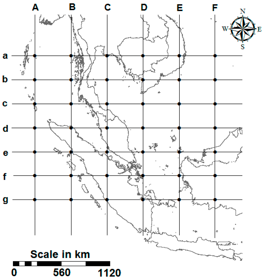 The climatic system is influenced by the combined action of multiple atmospheric variables in a wide tempo-spatial space. Any single circulation predictor and/or small tempo-spatial space are unlikely to be sufficient for climate projection, as they fail to capture key rainfall mechanisms based on thermodynamics and vapor content [46]. Following the suggestions of Wilby and Wigley [47], the regional synoptic circulation patterns that contributed to the anomalous rainfall pattern in Malaysia were considered in the selection of the spatial domain of each predictor, represented as 42 grid points surrounding the study area. All 26 daily NCEP variables at 42 NCEP grid points surrounding the study area (Figure 2) (total 26 × 42 = 1092) were individually correlated with local extreme rainfall events. The non-parametric Kendall tau correlation coefficient was used to measure the degree of association between NCEP variables and local extreme rainfall events. Finally, the NCEP variables that have a strong correlation with a particular rainfall event at a particular rainfall station were used for the selection of the final set of predictors through stepwise regression processes to downscale the corresponding rainfall event at that station.