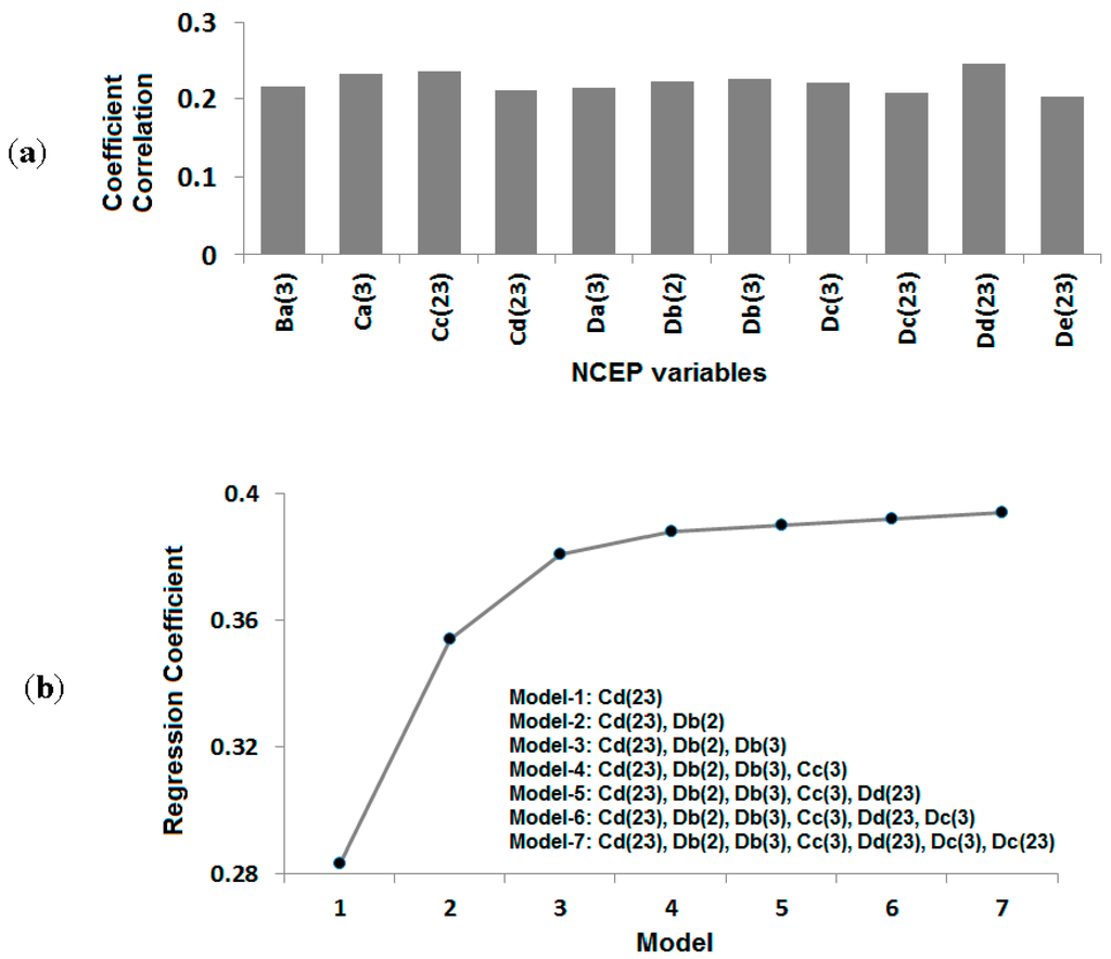 For the selection of predictors, the NCEP variables from 42 grid points surrounding the study area were individually correlated with local rainfall events. The NCEP variables from different grid points, having high correlation with heavy rainfall event at Dungun station, are shown in Figure 3a. In the figure, the capital letter in an NCEP variable name represents the column and the lower case letter represents the row of the NCEP grid point, as shown in Figure 2. The number in brackets represents the NCEP variable, as described in Table 1. Therefore, Cd(23) represents relative humidity at 500 hPa at the grid point located in column “C” and row “d”. Eleven NCEP variables from different grid points were found to have high correlation with a heavy rainfall event. These NCEP variables were used to select the final set of predictors for the downscaling using stepwise multiple regression. Stepwise multiple regression is a way of choosing predictors of a particular dependent variable on the basis of statistical criteria, such as an F-test or adjusted R-squared test. Stepwise multiple regression adds and removes predictors, in a stepwise manner, until there is no justifiable reason to add or remove more. Therefore, it allows the selection of the subset of independent variables that is the best predictor. The plot of regression coefficients between different subsets of independent variables and 90th percentile rainfall events at Dungun station is shown in Figure 3b. The figure shows that the model performance increases with the inclusion of more NCEP variables. However, it does not increase substantially after the inclusion of more variables with three independent variables, namely Cd(23), Db(2) and Db(3). Therefore, these three NCEP variables were finally chosen as predictors for the downscaling of heavy rainfall days at Dungun station.