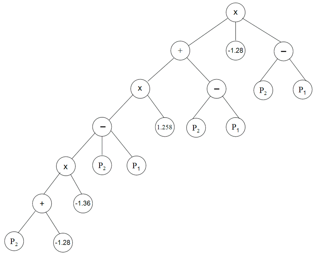 The tree structure representations of symbolic expressions produced by GP for heavy rainfall event downscaling at Besut (descriptions of P1, P2 and P3 are given in Table 3).