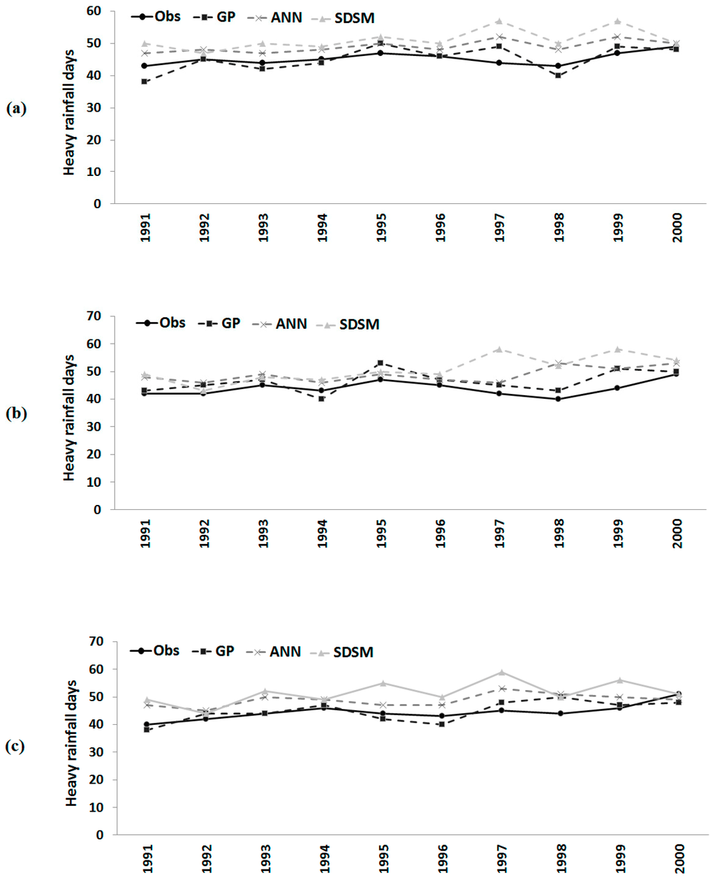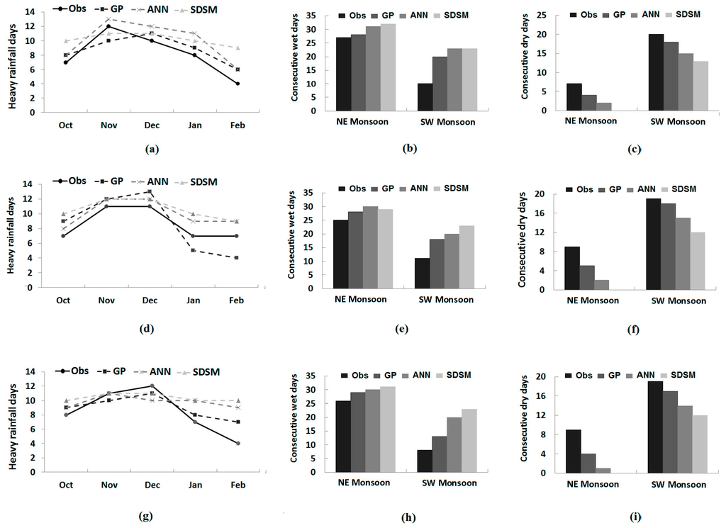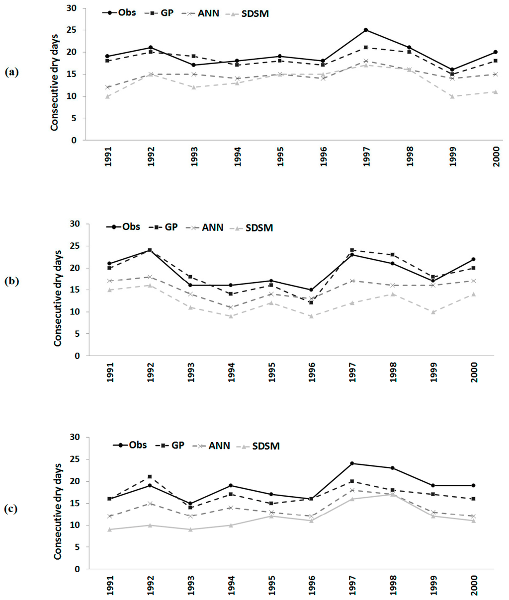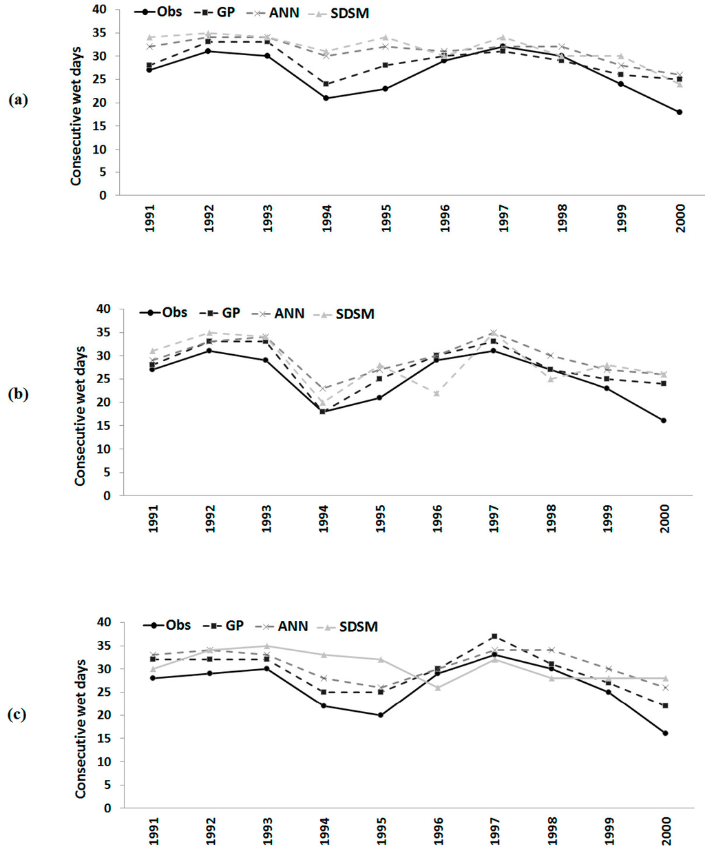 The number of consecutive wet days in two major seasons (SW monsoon and NE monsoon) was overestimated by the ANN and SDSM during the validation period at all three stations (Figure 9). GP also overestimated the number of consecutive wet days, but GP downscaled values were found to be closer to observed values compared to those downscaled by the ANN and SDSM in both of the seasons and at all of the stations. Table 7 shows that the errors in estimation of seasonal consecutive wet spells estimated by GP are always less compared to those estimated by the ANN and SDSM. Errors in the downscaling number of seasonal dry spells are also found to be less for GP. It can be seen from Figure 9 that downscaled lengths of seasonal dry spells estimated by GP, the ANN and the SDSM are lower than the observed number of consecutive dry days in both seasons at all of the stations. However, GP downscaled values were still found to be closer compared to those downscaled by the ANN and SDSM.