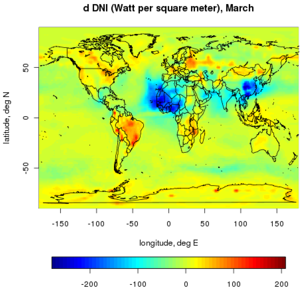 Illustration of the difference in surface radiation (Air Mass = 2), here direct normal irradiance for March, induced by the use of different aerosol climatologies (Kinne versus Global Aerosol Data Set/Optical Properties of Aerosols and Clouds (GADS/OPAC), see Section 2 for further details about the climatologies). The large differences in Direct Normal Irradiance (DNI) illustrates that the mix of different data sources is expected to lead to serious inhomogeneities in climate data records.
