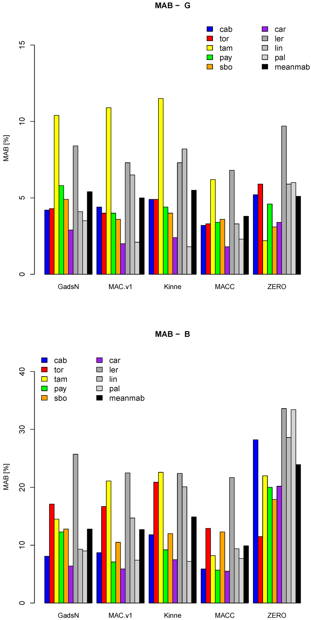 Mean Absolute Bias (mean absolute difference) of the global irradiance (MAB-G, top) and the direct irradiance (MAB-B, bottom) for the investigated aerosol climatologies evaluated at nine different Baseline Surface Radiation Network (BSRN) stations (colored bars). “meanmab” is the mean MAB over all nine stations. The effect of aerosols on direct irradiance is much more pronounced. As a result much higher errors are apparent for direct irradiance.