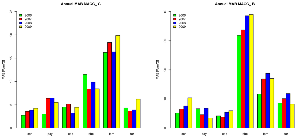 In order to get a first hint about the potential of inter-annually resolved data the year to year results are shown for the MACC climatology in Figure 4. It is remarkable that the error (MAB) of the climatologies (see Table 2) at the “clear sky” stations (Tamanrasset and Sede Boger) where higher aerosol variations are expected are significantly larger than the year to year variation. This indicates that an improvement of the climatology might be of higher priority, whereas the errors induced by the use of long term monthly means instead of annually resolved monthly means might be of lower priority.