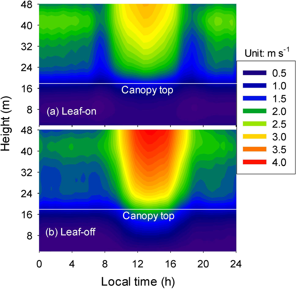 Diurnal courses of horizontal wind velocity profile during the leaf-on (a) and leaf-off (b) seasons of 2012.