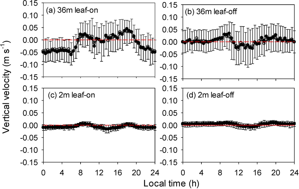 The vertical wind velocity at 36 m (after planar-fit coordinate rotation) had a distinct diurnal pattern during the leaf-on season, with upward directions (positive values) in the daytime and downward directions (negative values) in the nighttime (Figure 3a). The vertical velocity at the 2 m was slightly downward at most times except for mid-morning and early-evening (Figure 3c). The nocturnal vertical velocity was in the order of −0.05 m∙s−1. The mean vertical velocities during the leaf-off season were near zero all day long (Figure 3b,d), although the variability between days was comparable with those during the leaf-on season.