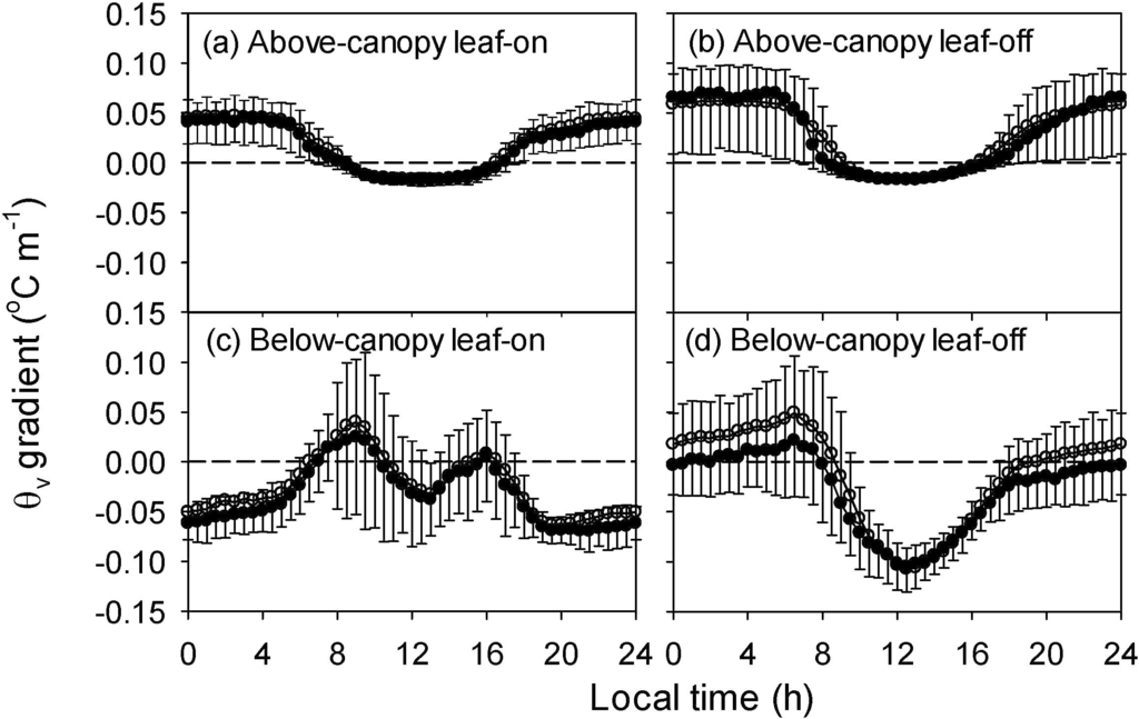 Diurnal courses of the gradients of virtual potential air temperature (θv) above (16 m–48 m) and bellow (2 m–16 m) the canopy during the leaf-on and leaf-off seasons of 2012. (a) above-canopy for leaf-on season, (b) above-canopy for leaf-off season, (c) below-canopy for leaf-on season, and (d) below-canopy for leaf-off season. Open circles are mean values, filled circles are the median and error bars indicate the range between the 25 and 75 percentile, respectively. The dashed lines are zero gradients.