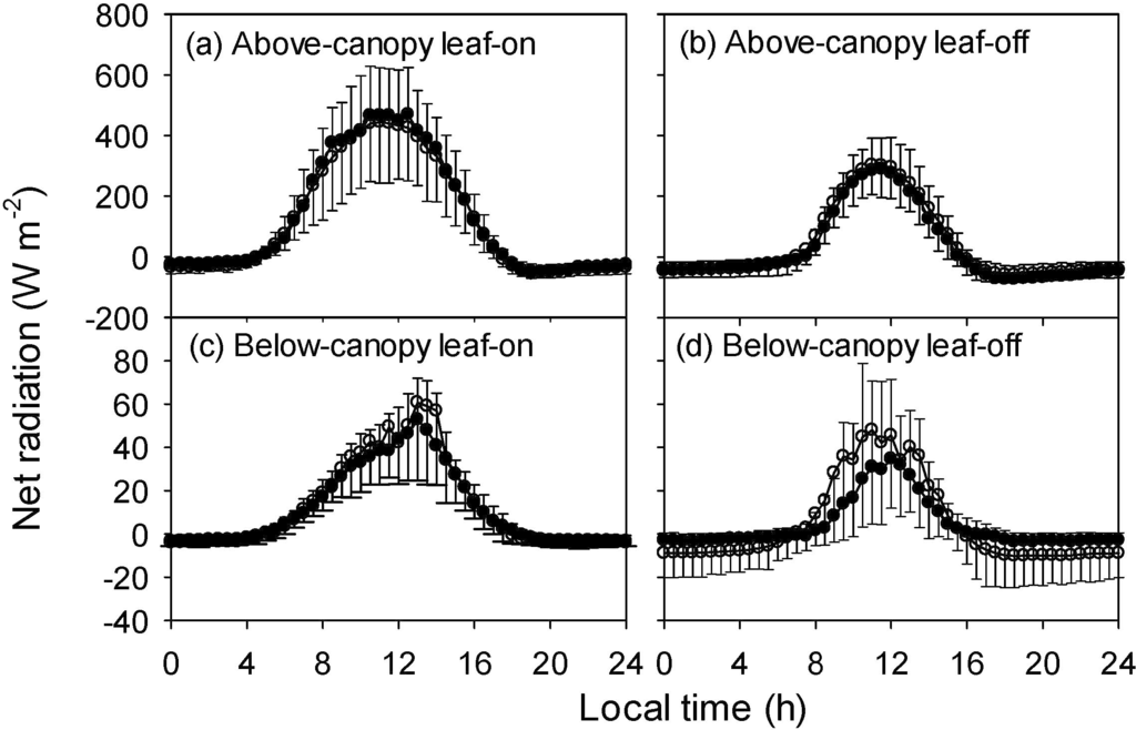 Diurnal courses of the net radiation above (48 m) and bellow (2 m) the canopy during the leaf-on and leaf-off seasons from May of 2013 to April of 2014. (a) 48 m for leaf-on season, (b) 48 m for leaf-off season, (c) 2 m for leaf-on season, and (d) 2 m for leaf-off season. Open circles are mean values, filled circles are the median and error bars indicate the range between the 25 and 75 percentile, respectively. The dashed lines are zero radiations.