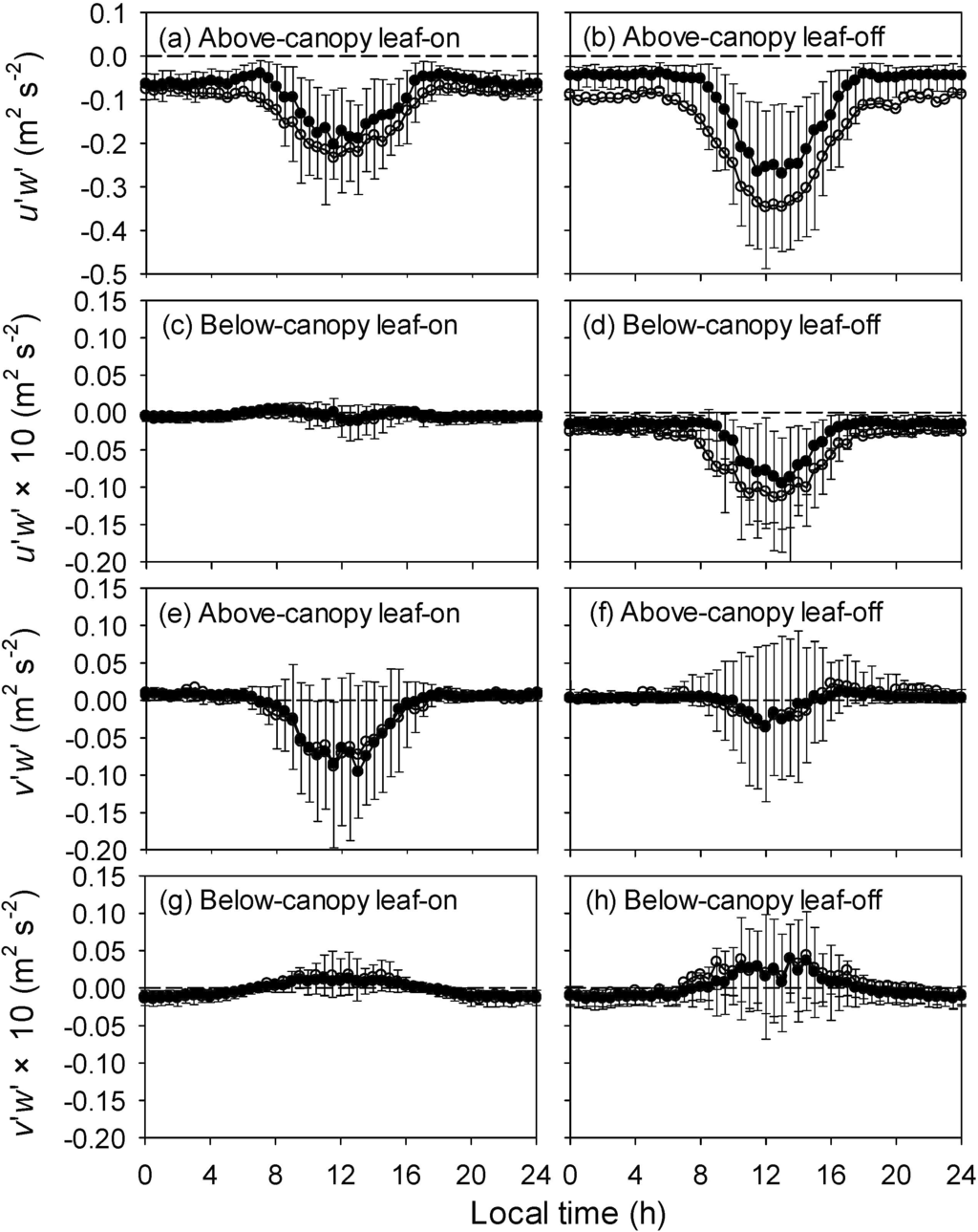 Diurnal courses of Reynolds stress components above (48 m) and bellow (2 m) the canopy during the leaf-on and leaf-off seasons of 2012. (a)–(d): longitudinal Reynolds stress, (a) 36 m for leaf-on season, (b) 36 m for leaf-off season, (c) 2 m for leaf-on season, and (d) 2 m for leaf-off season, (e)–(h): lateral Reynolds stress, (e) 36 m for leaf-on season, (f) 36 m for leaf-off season, (g) 2 m for leaf-on season, and (h) 2 m for leaf-off season. Open circles are mean values, filled circles are the median and error bars indicate the range between the 25 and 75 percentile, respectively. The dashed lines are zero gradient. Note the different vertical axis in the upper-most row of the panels.