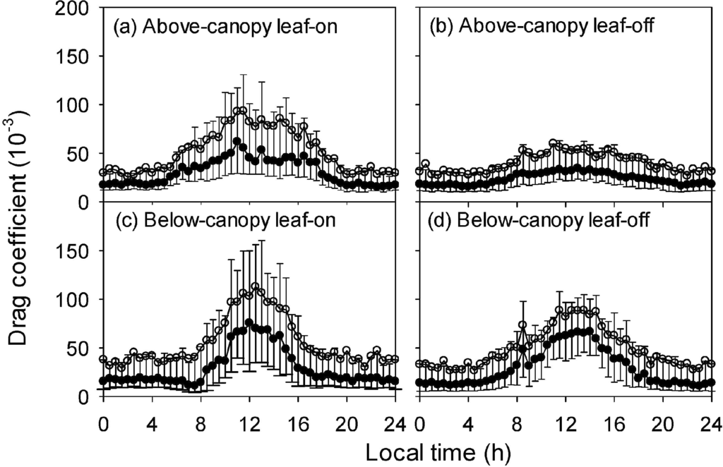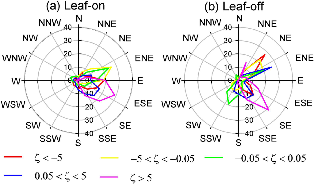 The frequencies of stability regimes were shown in Figure 6. At the 36 m height, the moderate unstable conditions dominated in the daytime and moderate stable conditions were prevailed during the night for both seasons. However, at the 2 m height, these situations were reversed, except for the daytime during the leaf-off season. This suggested the local stability of below-canopy layer was often opposite to that of above-canopy layer, which was due to the canopy isolation of vertical momentum and heat transport. Decoupling of above-canopy unstable and sub-canopy stable layers was also observed in relative open forest canopy at night, which was due to quite different mechanisms with that in dense canopy [6].