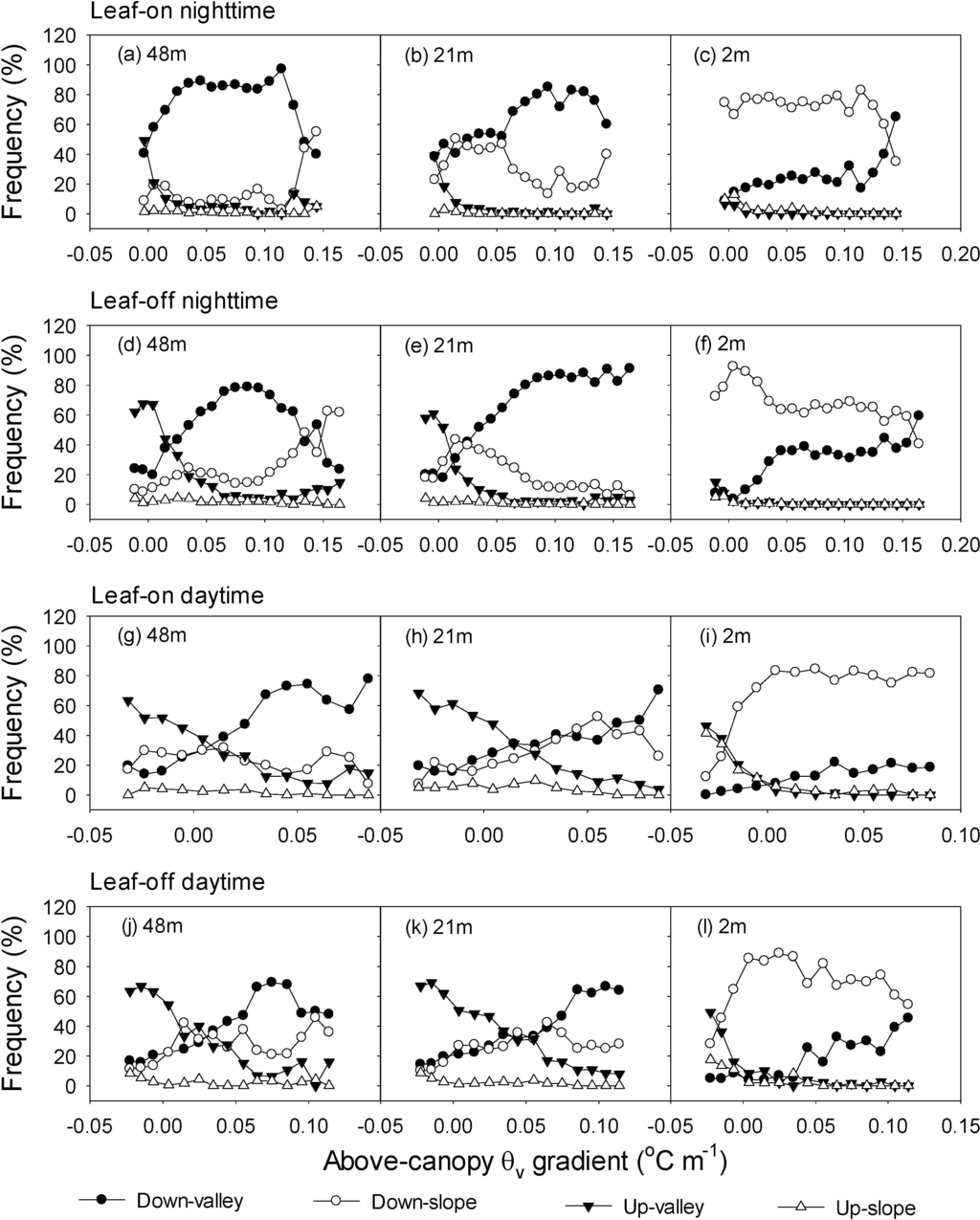 Changes of the relative frequency of mean wind direction sector at the 48 m, 21 m and 2 m with the gradient of above-canopy virtual potential air temperature (θv) in 2012. (a), (b), (c) are in the nighttime for 48 m, 21 m and 2 m in the leaf-on season, respectively, and (d), (e), (f) are in the nighttime for 48 m, 21 m and 2 m in the leaf-off season, correspondingly, (g), (h), (i) are in the daytime for 48 m, 21 m and 2 m in the leaf-on season, respectively, and (j), (k), (l) are in the daytime for 48 m, 21 m and 2 m in the leaf-off season, correspondingly.