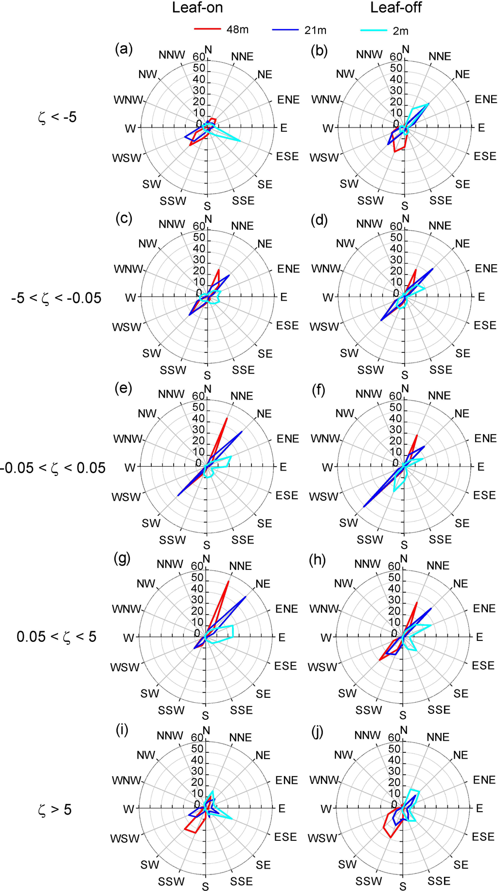 Relative frequency distributions of wind direction at the 48 m, 21 m and 2 m for five stability regimes during the leaf-on and leaf-off seasons of 2012. (a) and (b) are for ζ< −5 in leaf-on and leaf-off seasons, correspondingly. (c) and (d) are for −5 < ζ < −0.05 in leaf-on and leaf-off seasons, respectively. (e) and (f) are for −0.05 < ζ < 0.05 in leaf-on and leaf-off seasons, respectively. (g) and (h) are for 0.05 < ζ < 5 in leaf-on and leaf-off seasons, respectively. (i) and (j) are for ζ > 5 in leaf-on and leaf-off seasons, correspondingly.