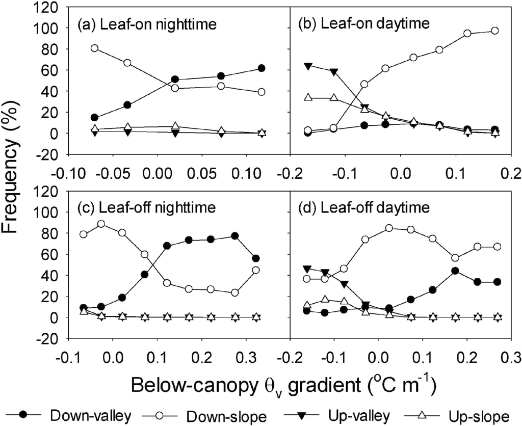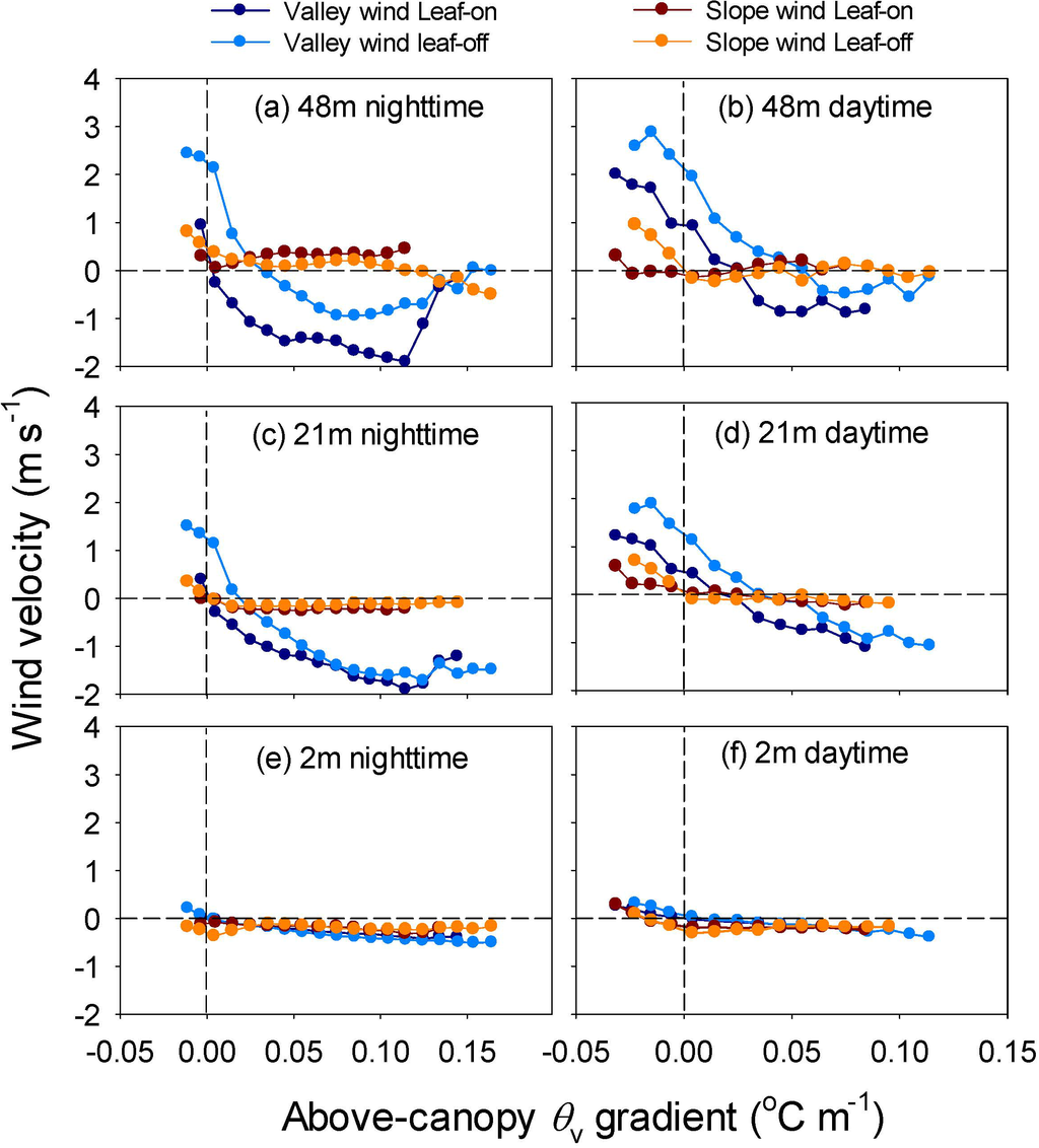 The velocities of the valley and slope winds were overall negatively correlated with the θv gradient (Figure 11). This suggested that the down-valley and down-slope winds were favored by the strong negative buoyancy (positive temperature inversion). However, there were distinct differences between valley and slope winds, between nighttime and daytime and between seasons. Compared with slope wind, the valley wind was more sensitive to the change of the above-canopy thermal gradient. At the same level of thermal inversion, the down-valley and down-slope winds were stronger in the nighttime than in the daytime. In addition, the down-valley wind was slightly stronger in the leaf-on season than in the leaf-off season.