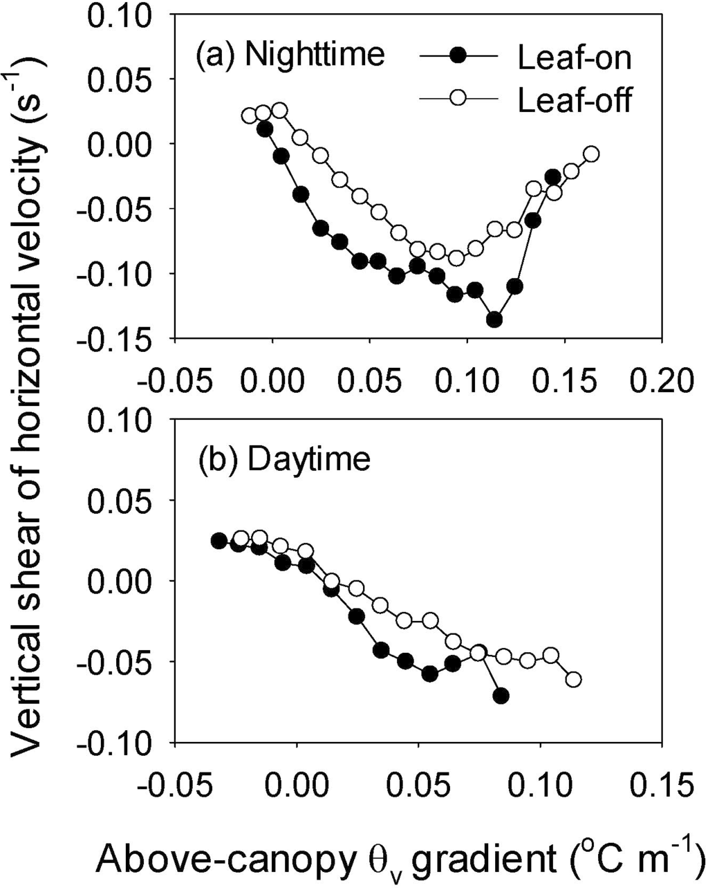 Changes of the vertical shear of horizontal wind speed between 42 and 48 m with the gradient of above-canopy virtual potential air temperature (θv) in the nighttime (a) and daytime (b) in 2012.