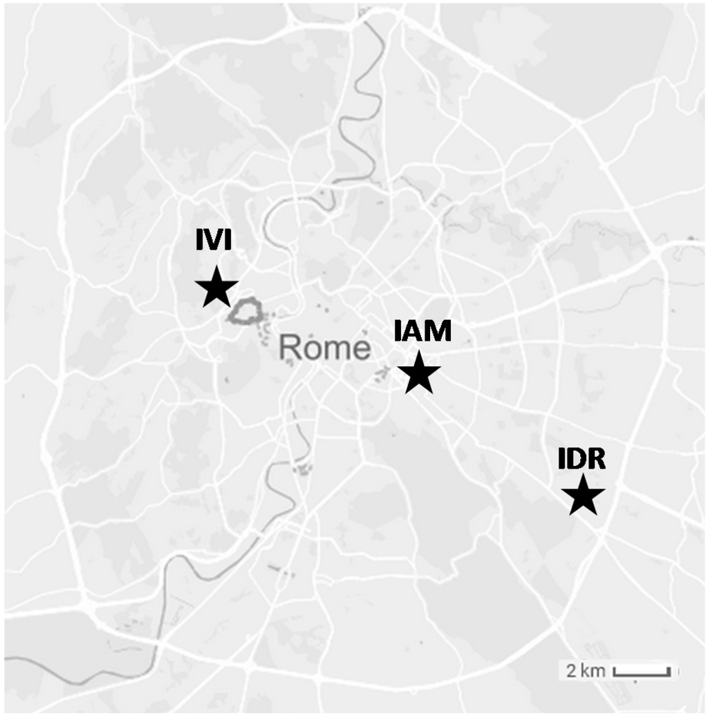 The study was carried out in three primary schools located in the city of Rome, as shown in Figure 1. The first school, labeled IAM, is located in a heavily populated residential area, surrounded by low-traffic roads. The second school, labeled IVI, is located at about 3.5 km from the city center; the front facade is 50 m from a square with high traffic intensity during rush hours. The school labeled IDR is located about 8 km from the city center in the eastern part of the city, in a less populated residential area very close to the Rome orbital highway.