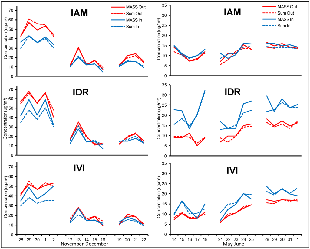 Winter and spring/summer indoor and outdoor PM2.5 mass concentration determined gravimetrically (solid lines) and reconstructed by adding the single analytical determinations (dotted lines) are reported in Figure 2.