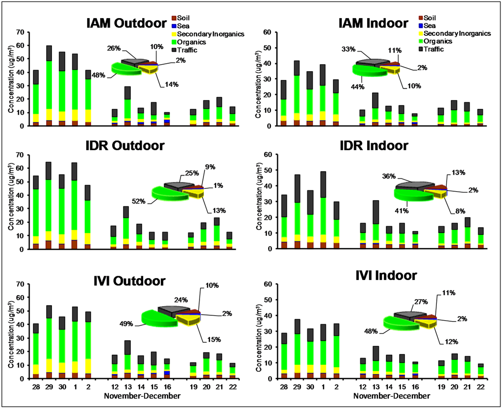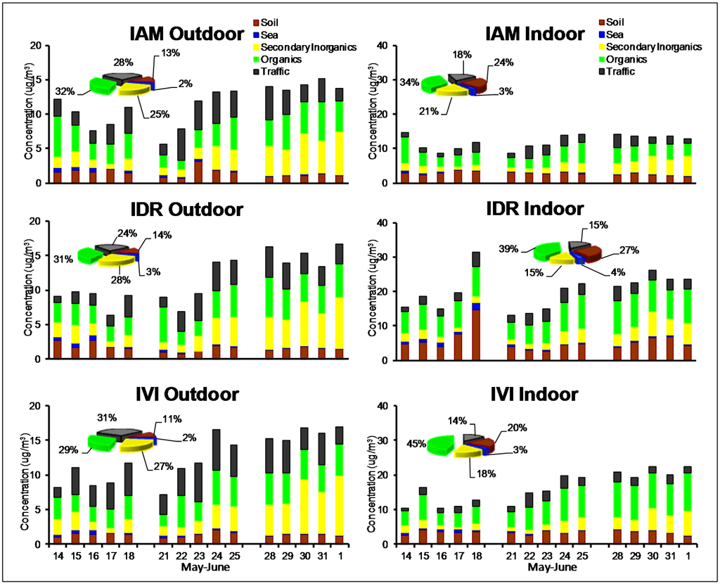 Indoors, the contribution of soil accounted as the second most important source after organics at all sites. Outdoor and indoor daily composition showed a significant difference between the first and second half of the campaign, when a change in the meteorological conditions occurred. The effect of stable conditions is clear on that species produced by secondary processes (organics and secondary inorganics), which showed a concentration increase both outdoors and indoors.