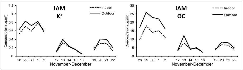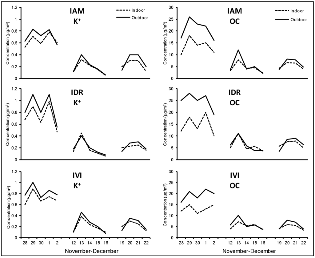Outdoor and indoor time pattern of K+ and OC at IAM site during the winter campaign.