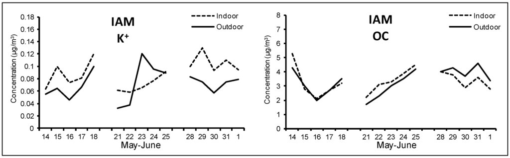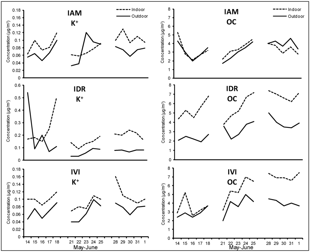 Outdoor and indoor time pattern for K+ and OC at IAM site during the spring/summer campaign.