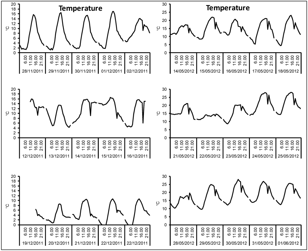 Time pattern of temperature during the winter and spring/summer campaigns.