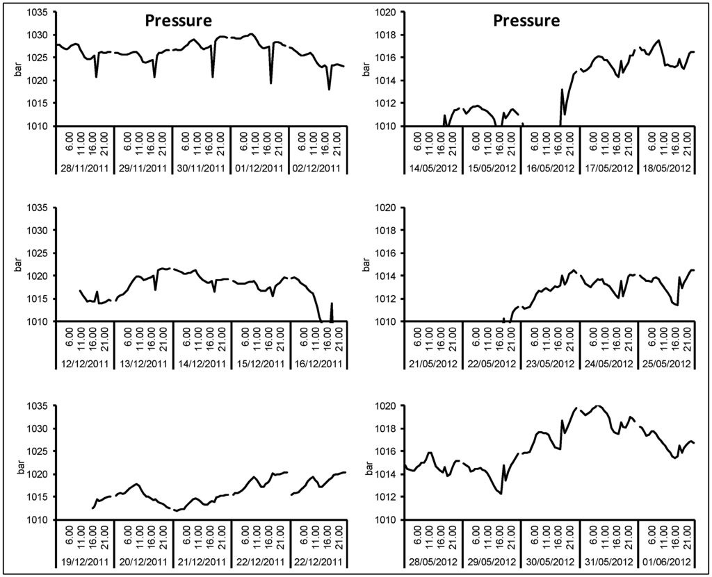 Time pattern of atmospheric pressure during the winter and spring/summer campaigns.