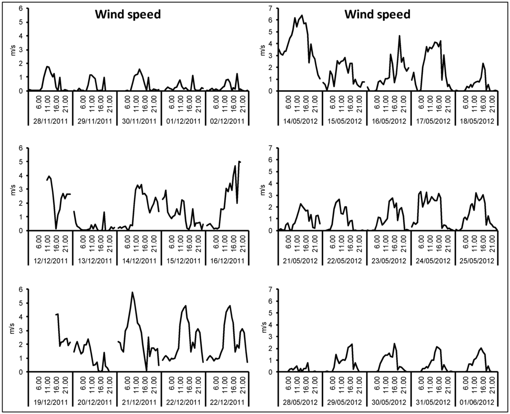 Time pattern of wind speed during the winter and spring/summer campaigns.