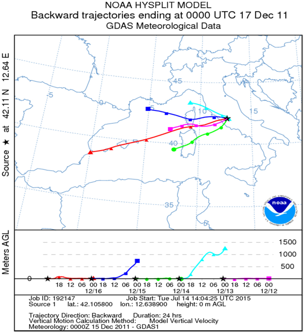 Backward trajectories of the air masses during 12, 13, 14, 15 and 16 December (duration 24 h). HYSPLIT model [34].