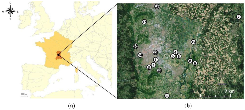 Location of the study area in the Auvergne region (dark orange) of central France (a), and the locations of the 17 schools in the Clermont-Ferrand area (b).
