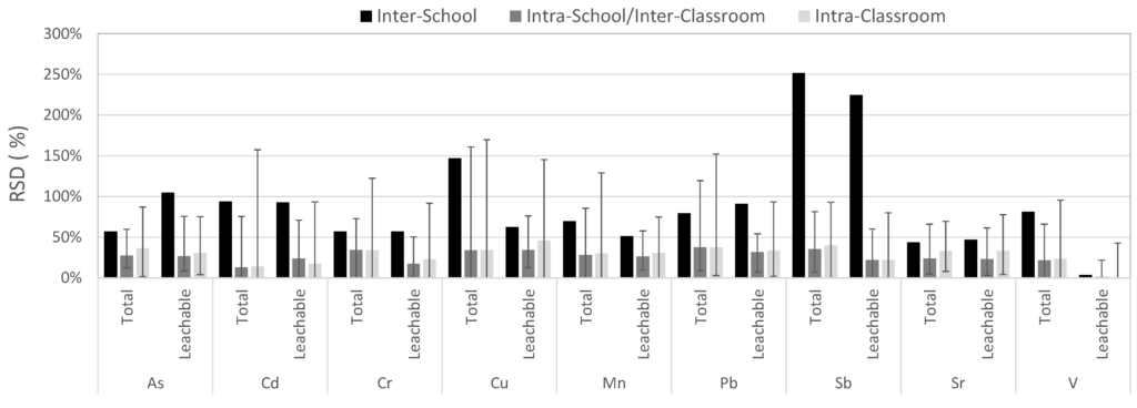 The intra-classroom variability varied from 0 to 170% and was in the same order of magnitude as the intra-school/inter-classroom variability, which ranged from 0% to 161%. However, the RSD means for the intra-classroom and intra-school/inter-classroom scales were always lower than the RSD mean for inter-school variability. This result suggests that greater variability was seen between schools rather than between classrooms, indicating that school location (i.e., proximity to nearby local sources) is an important determinant for intra-classroom levels of metals.