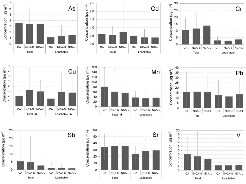 Mean metal loadings (total and leachable; μg·m−2) per sampling location. CA: Crossing area; NCA-S: Non-crossing area with dust accumulated over short periods; and NCA-L: Non-crossing area with dust accumulated over long periods. *: Denotes a significant difference within a group according to Friedman test results (p-value < 0.050).