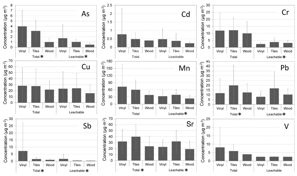Significant differences between the different floor types were found for loadings of leachable and total As, Pb, Sb and Sr and for loadings of leachable Cr and Mn (Kruskal-Wallis test, p-value < 0.050). Tiled floors showed higher leachable Cr, Pb, Mn and Sr loadings than vinyl floors, and vinyl floors presented higher leachable Sb loadings than tiled floors (Mann-Whitney test, p-value < 0.050). Tiled floors presented significantly higher total Pb loadings than vinyl floors and significantly higher total Sr loadings than wood and vinyl floors. These high loadings of Pb and Sr in tiles, when compared with other flooring materials, may be explained by the production process of tiles, which may include both metals in the ceramic glaze of tiles [32]. In addition, vinyl floors presented significantly higher total Sb loadings than tile and wood floors, which indicate that this type of floor has Sb in its composition. In fact, Sb is known to be used in the production of vinyl floors in the form of antimony trioxide (SbO3), used as a chemical synergist in chlorinated and brominated flame retardants to increase the retardants’ effectiveness [33]. Finally, wood floors presented significantly lower leachable and total As loadings than vinyl and tile floors (Mann-Whitney test, p-value < 0.050).