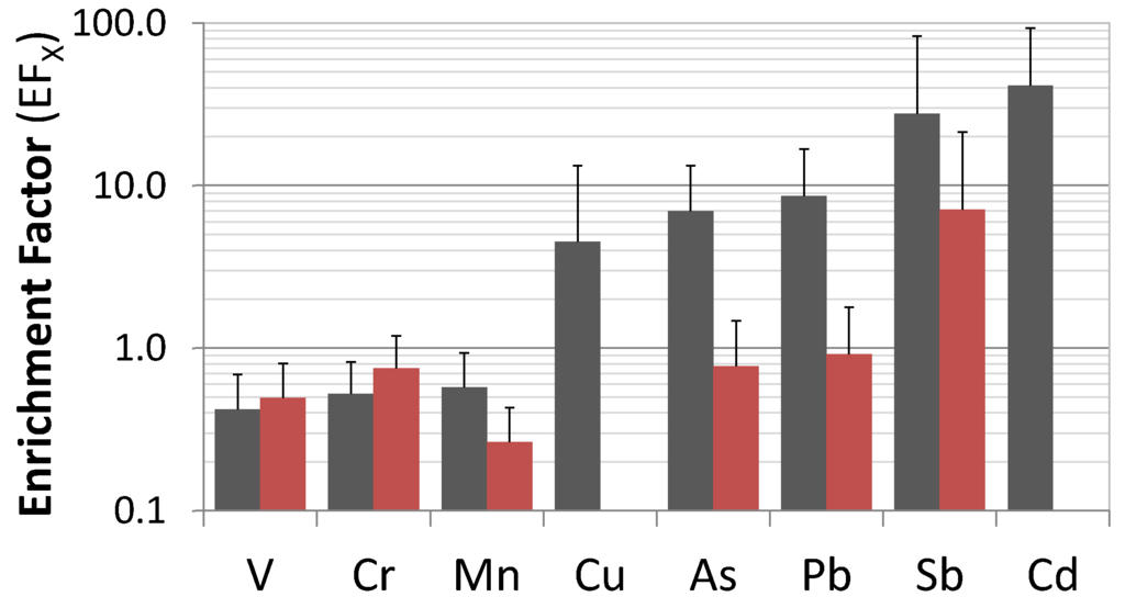 Based on soil composition values presented by Mason and Moore [35], the only heavily enriched elements (EFs > 10) were Cd and Sb, which are of anthropogenic origin (e.g., traffic emissions mainly from tire and brake wear [34,37]). Mean EF values for Cu, As and Pb approached 10 and were greater than 10 in some classrooms, which indicates the contribution of specific non-crustal sources for these metal loadings in many classrooms.