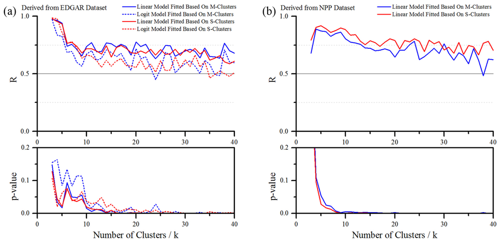 After clustering, the new Ravg_e and Ramp_n in the cluster region scale based on the clustering result were also calculated. They are illustrated in Figure 2. As shown in the figure, these correlation coefficients continuously remain at a relatively high level when k ranges from 3 to 40, although there is a slight decrease associated with the increase of k when a linear or logarithmic model is used. These results respectively prove the strong positive correlations in the cluster scale between Xco2 averages and CO2 emissions, and between Xco2 amplitudes and NPP. Compared to the analysis results before clustering, these results reveal the distribution information on both anthropogenic emissions and NPP.