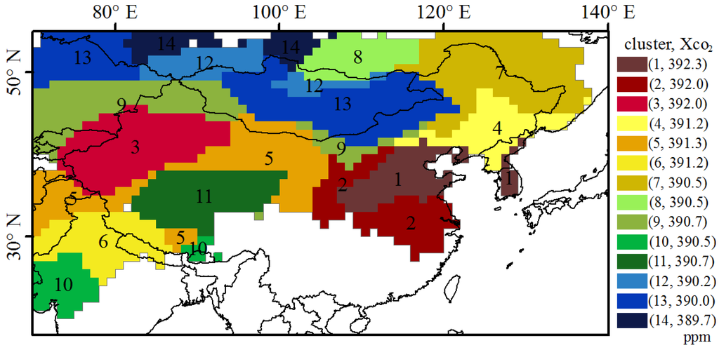 Figure 3 presents the results of 14 clusters obtained using the clustering method described in Section 2.2, and the mean Xco2 in each clusters. As shown in the figure, Xco2 data of Clusters 1 and 2 in Central and Eastern China are the maximum, followed by those of Cluster 3 in Xinjiang province in Western China. Xco2 data of Clusters 12, 13, and 14, located around Inner Mongolia, Mongolia, Northeastern Kazakhstan, are the minimum.