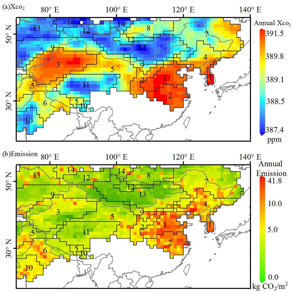 From a comparison of the spatially distributed borders of clusters shown in Figure 4a with emissions in Figure 4b, it is obvious that the areas of Clusters 1, 2, and 4 with large Xco2 values coincide with high emissions, whereas Clusters 11, 12, and 13 with small Xco2 values correspond to the low emission areas in Mongolia, part of Inner Mongolia and Xizang in China. The exception is Cluster 3, located in Xinjiang province in western China, where Xco2 is very high but emissions are not.