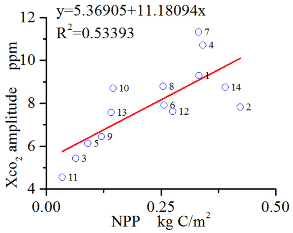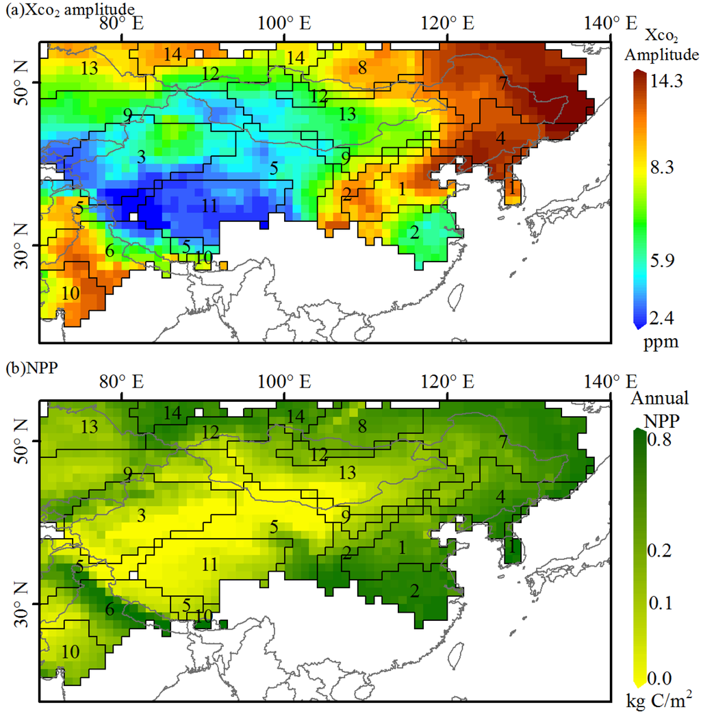 It is evident that the spatial distribution of Xco2 amplitudes are generally in agreement with the spatial trend of NPP. Clusters 1, 4, 7, and 14 with large amplitudes of Xco2 show significant corresponds to high NPP, while Clusters 3, 5, and 11 with small amplitudes of Xco2 demonstrate low NPP. This indicates that the impact of NPP, a measurement of vegetation activities, on the seasonal changing amplitudes of Xco2.