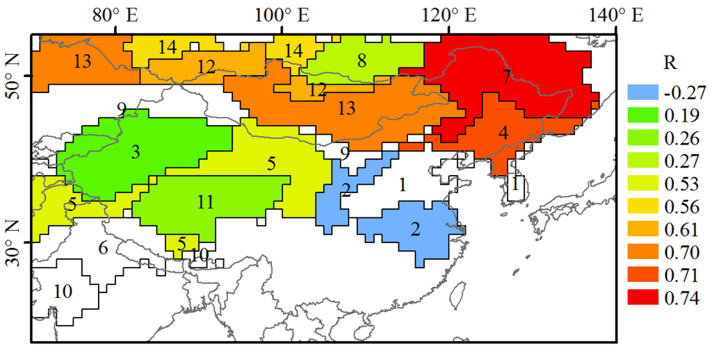 The correlation coefficients between seasonal amplitudes of Xco2 and NPP for each cluster are shown in Figure 7. It is shown that correlations between the Xco2 amplitude and NPP are mostly positive; moreover, the larger NPP is, the higher the correlation coefficient is, except for Clusters 1 and 2, which are the maximum emission areas (shown in Figure 4b), and Cluster 9.