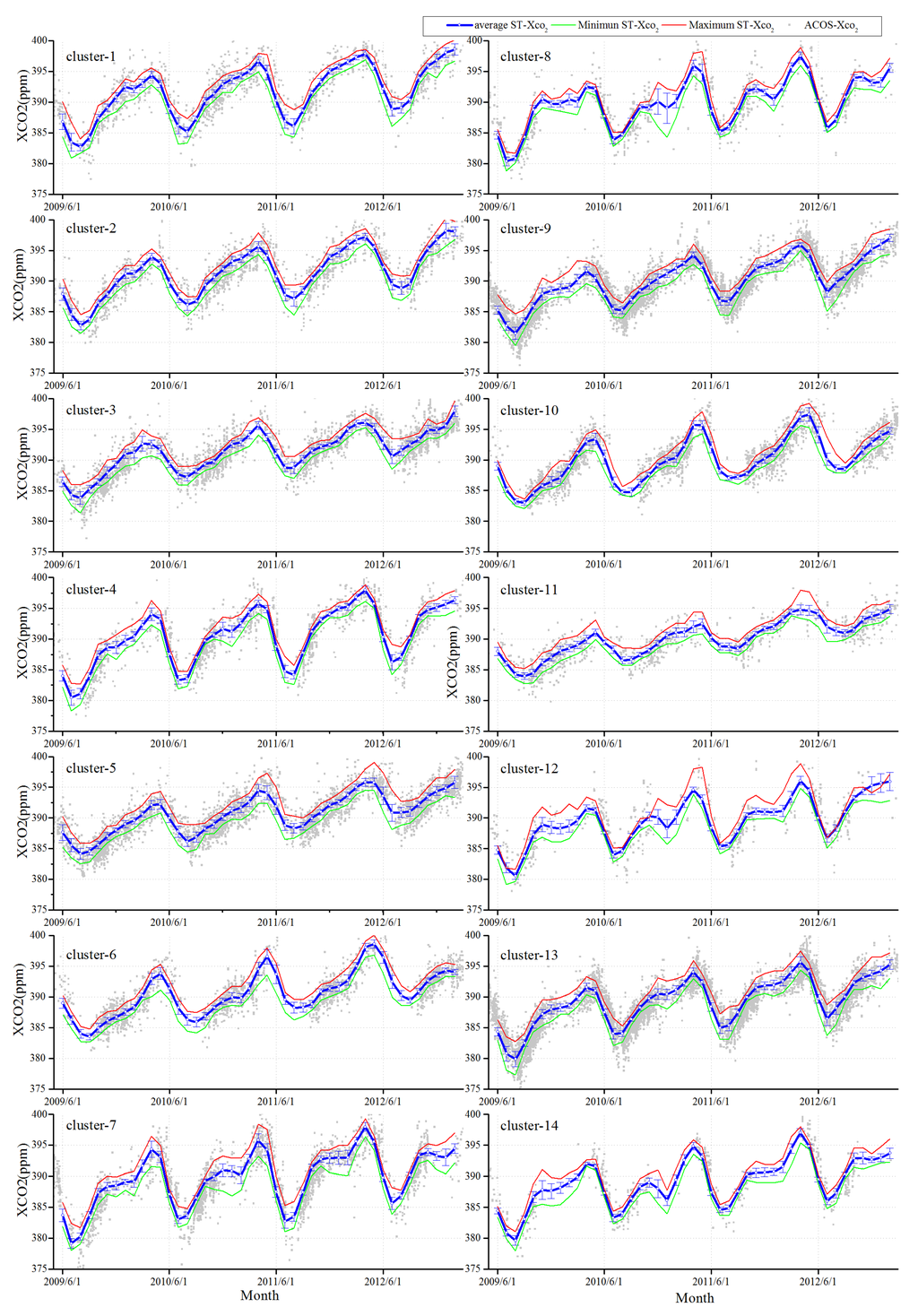 Variation of monthly averaged Xco2 in each Cluster (number of clusters k = 14). Blue, green, and red lines correspond to average, minimum, and maximum Xco2 values in each cluster, respectively, derived from the gap-filled Xco2 dataset. Error bars represent one standard deviation of Xco2, and the grey scatter points correspond to original observations from the ACOS-Xco2 dataset.