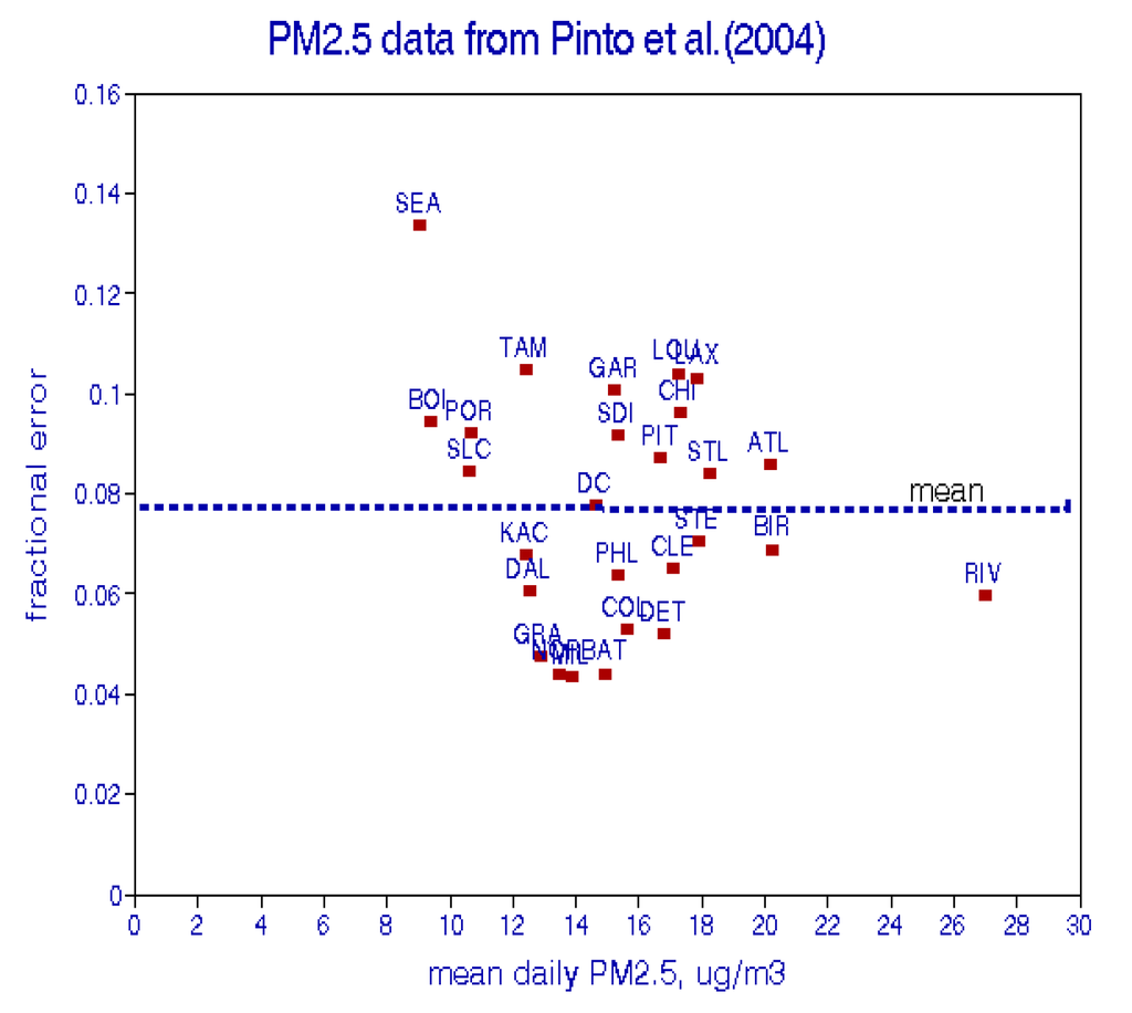 The daily PM2.5 data of Pinto et al. [16] for 27 urban areas that had multiple monitors for the year 2000 appear to be the best dataset for studying intracity spatial variations. Pinto et al. list the ranges in inter site means and site-pair correlations as indices of spatial variability. The correlations between pairs indicate their consistency over time irrespective of mean values, which is important for time-series studies. The ranges of mean values indicate variability for use in long-term studies. Neither of these statistics provides direct estimates of spatial uncertainties in outdoor air quality for comparison with those for indoor air quality, which are estimated as follows.