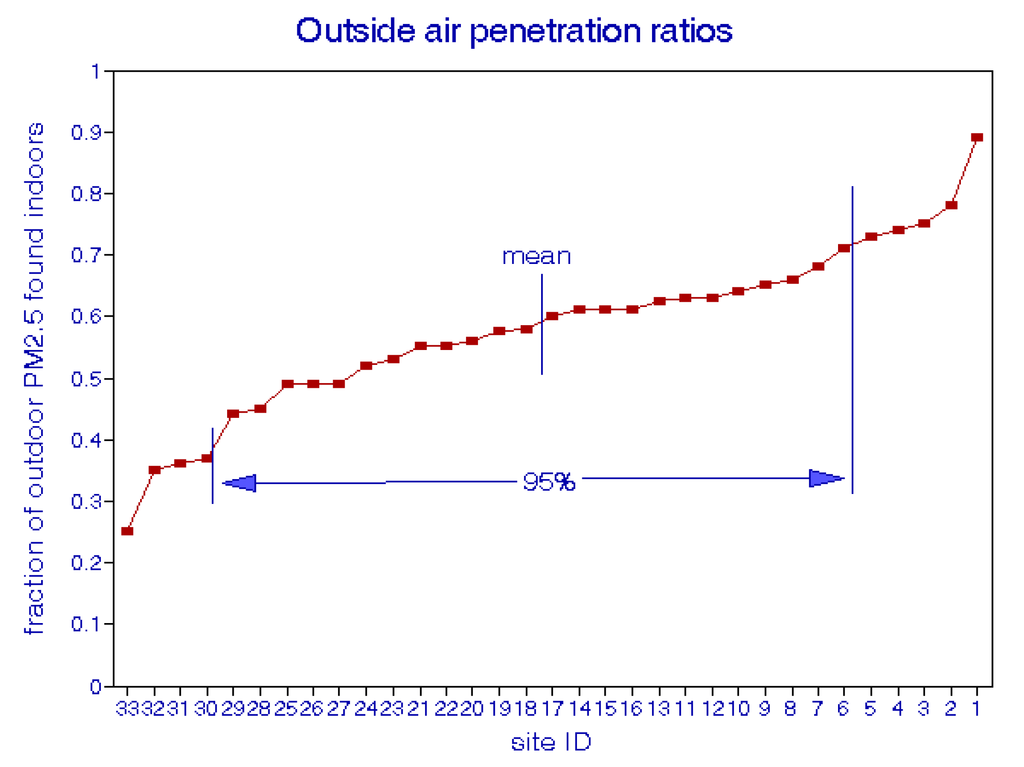 Infiltration has been studied extensively in USA and abroad. A good approximation of the mean rate is about 0.50 and a typical distribution is shown in Figure 3; the standard deviation is about 0.07 [9]. However, epidemiology studies involve large populations and community averages over thousands of residences. The variability among individual buildings is thus of little importance, assuming minimal seasonal variations or correlations with other community attributes like income, education, proximity to pollution sources like traffic. Nevertheless, accounting for infiltration has the effect of doubling risk estimates because only half of the outdoor concentration could be responsible for health effects observed indoors.