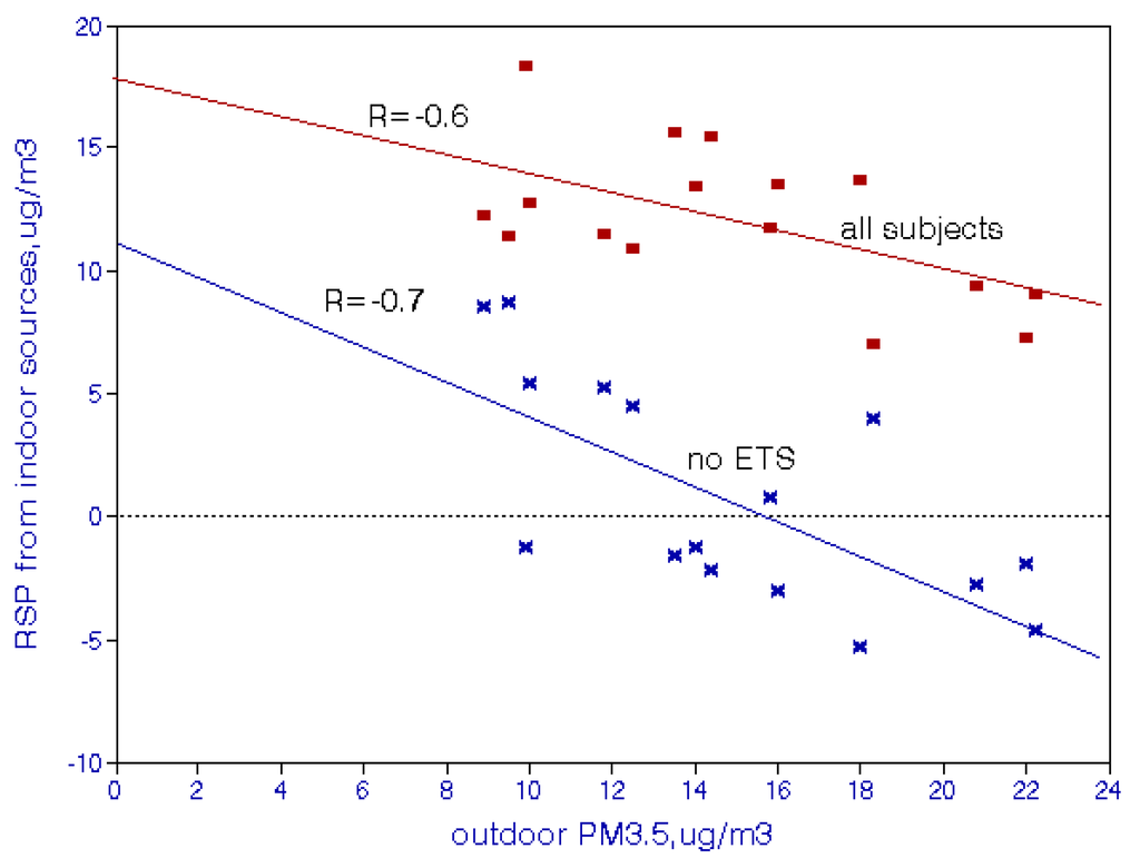 Adverse effects of ETS have been reported in epidemiological studies [25,26]. However, I found no air pollution studies that accounted for ETS increments to PM exposures. “Control” for passive smoking in regression analysis does not meet this requirement. In this regard, “% smokers” is probably a more appropriate confounding variable than “yes/no” for individual primary smokers.