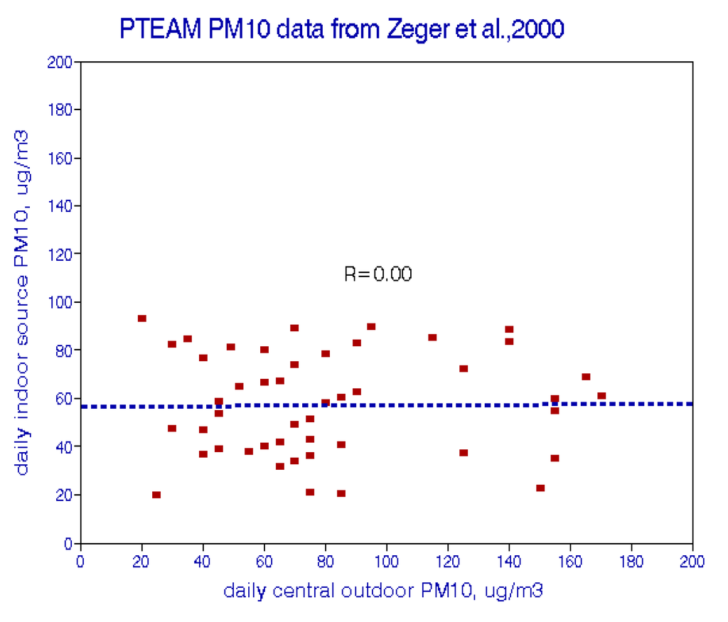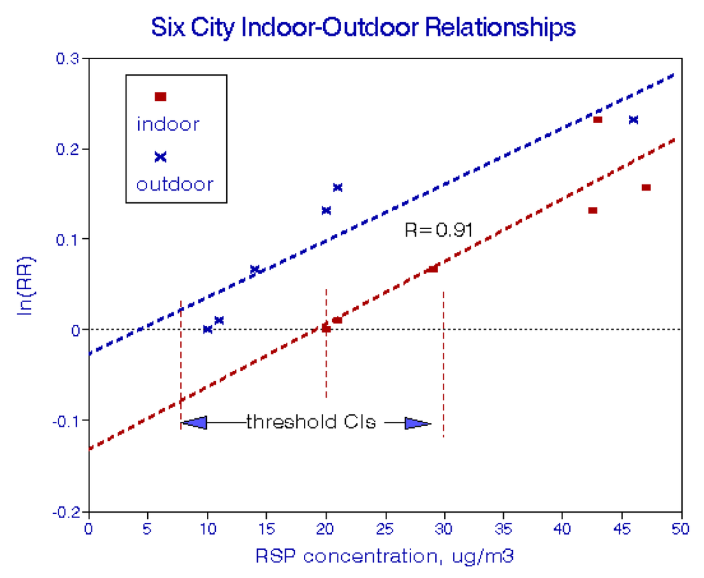 Figure 7 shows that indoor air quality is essentially unrelated to outdoor air quality across cities. Interpretation of all the extant cross-sectional studies, including cohort studies, is thus in question. Since such studies have played a large part in setting ambient air quality standards, this finding could have important regulatory implications.