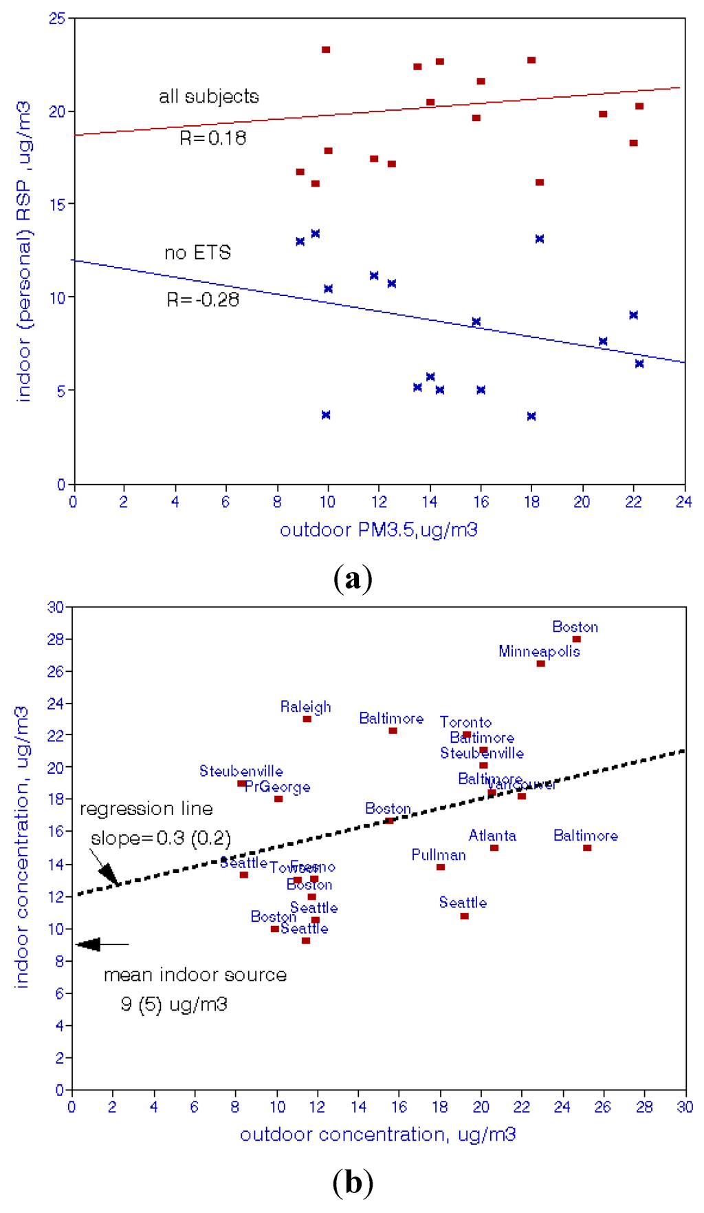 Mean particulate levels tend to vary more between cities than within a city, especially for fine particles. Jenkins et al. [20] sampled outdoor and indoor respirable particulates in 16 US cities; Avery et al. [23] present detailed PM2.5 sampling data from 34 USA cities. The contributions of indoor sources were estimated by subtracting 50% of the outdoor concentration from the indoor concentration. Caution is in order here because the small samples in each city may not adequately represent city-wide averages. These results are shown in Figure 7a,b which show that personal exposures cannot be predicted from outdoor concentration levels. The mean indoor source contribution from Avery et al. [24] is 9 μg/m3; from Jenkins et al. [21], 12 μg/m3 for all subjects and 0.9 μg/m3 in the absence of ETS. Thus, with respect to cross-sectional analysis, mean ambient concentration is a poor surrogate for actual (personal) exposure, even in nonsmoking households, even though they may be correlated over time in each city.