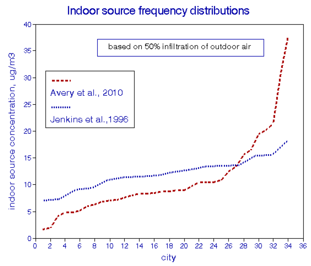 Frequency distributions of these two sets of multi-city data are shown in Figure 8. The distribution of data from Jenkins et al. [21] is well behaved, in contrast to the data from Avery et al. [24], for which about 7% of cities had lower concentrations than expected and about 25% were higher. The remaining two-thirds of the cities had indoor source contributions in the expected range of 5–10 μg/m3. Specific reasons for the different distributions in these two studies are unknown and may comprise further sources of uncertainty.