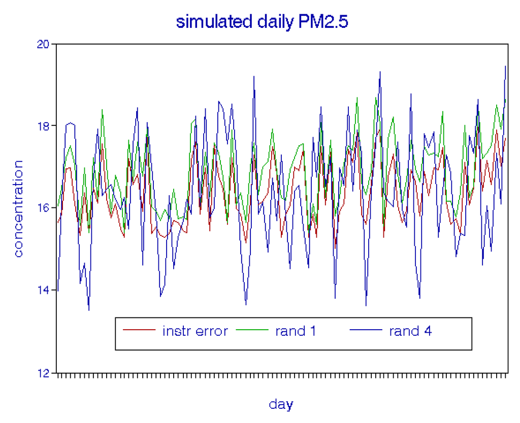 To illustrate potential effects of exposure uncertainties on epidemiological exposure-response relationships, a time-series of 1000 days and regressed simulated daily mortality variables against alternative exposure variables was simulated. Similar cross-sectional regressions for a cross-sectional dataset for 100 cities were ran. In the time-series analysis, the “true” PM2.5 concentration was set at 15 μg/m3 for all days, as if seasonal and temperature effects had been removed. Random effects of spatial variability of outdoor air and the penetration to the indoors were simulated; indoor sources were assumed to be invariant on a daily basis and were not considered. Since these simulated series have no serial correlation, lag effects could not be considered.